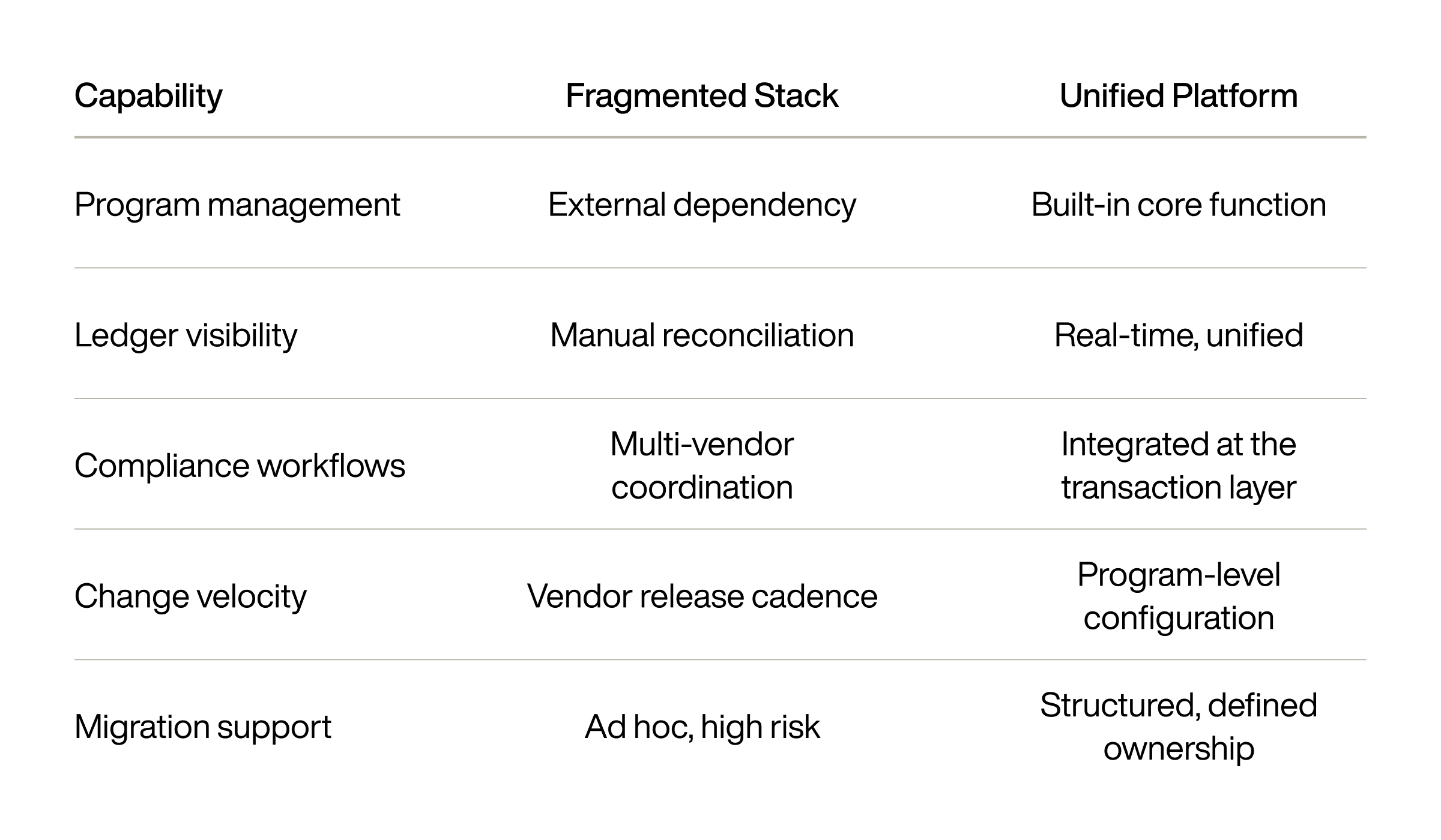 Evaluate what you need to own after you launch, not just at launch. A unified platform gives you direct control over authorization logic, ledger visibility, compliance workflows, and program management without coordinating across separate vendors. If your program needs to evolve quickly (new card types, new markets, new monetization models), a fragmented stack will introduce compounding operational drag at every change cycle.