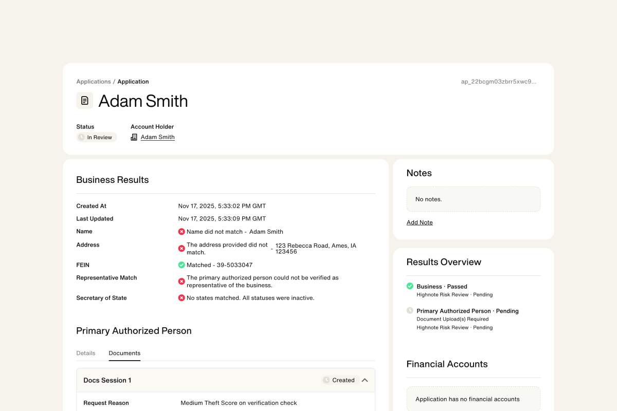 The Application Detail experience has been refreshed to better support complex identity and document scenarios within a single application. The new layout introduces a tabbed view to organize business and person entries, and a hierarchical display that clearly presents applicant details alongside related requests.